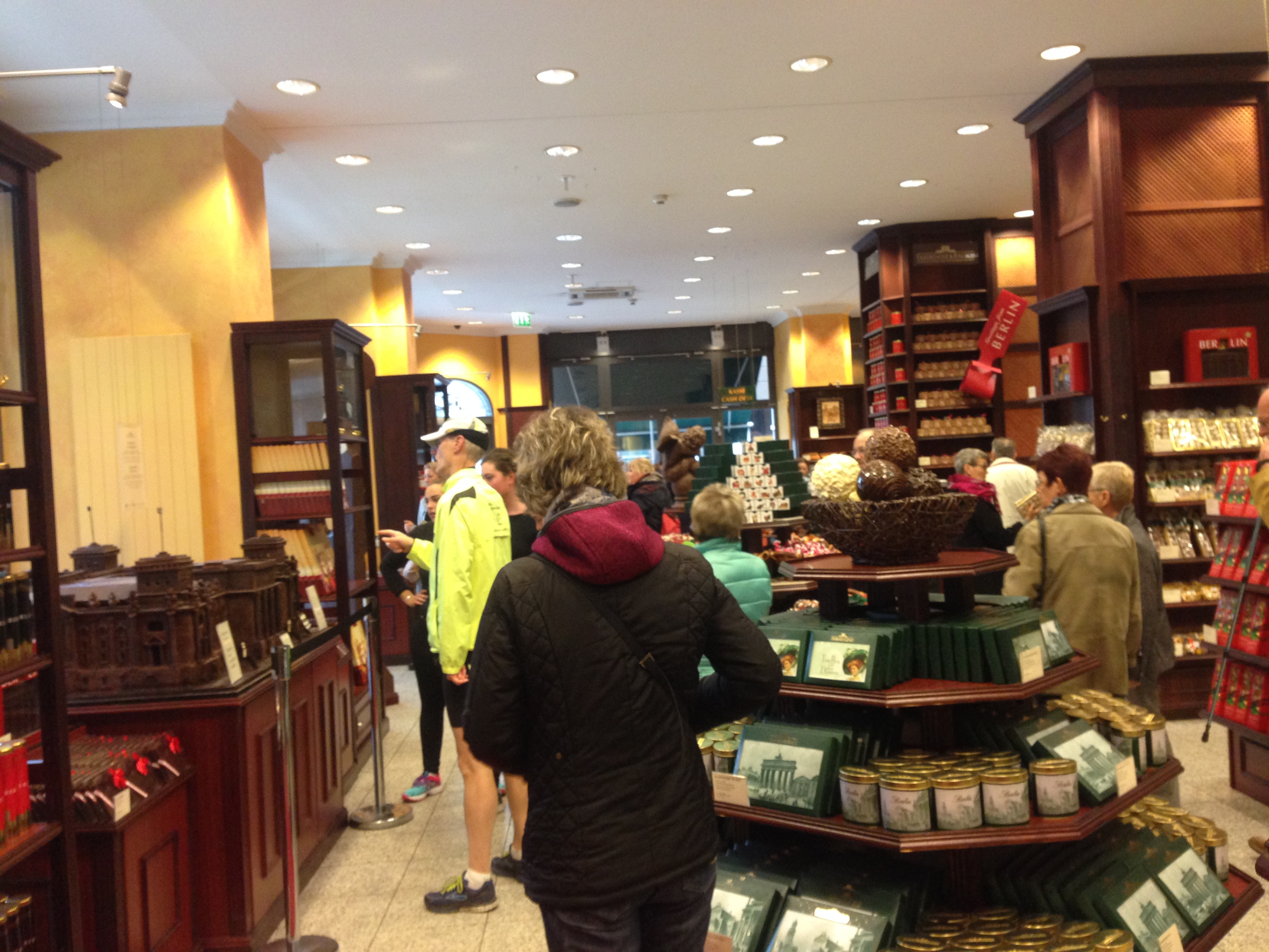 Bereits seit über 150 Jahren existiert Fassbender & Rausch. Seit 1999 wieder fast an seiner alten Stelle am Gendarmenmarkt, der nicht zu unrecht als der schönste Platz von Berlin bezeichnet wird. Schafft man es erfolgreich an den ganzen Kunden und Touristengruppen vorbei zu zwängeln, eröffnet sich auch für den erwachsenen Genießer das reinste Schlaraffenland der Schokoladen. Die Augen wissen schon gar nicht mehr wohin zu schauen. Der große Reichstag aus Schokolade oder doch der Vulkan, die Nase platt drücken an der langen, langen Pralinenthekre? Kleine Schoko-Berliner Bärchen kaufen? Feinste Trinkschokolade, beste Schokolade in allen Kakaostärken…ohwei ohwei….der erste Zuckerrausch ist schon gewiss. Aber wir sind ja Profis und es geht um den Baumkuchen, so!